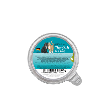 Turkey filet 40 %, tuna and turkey stock 37 %, tuna 10 %, turkey liver 5 %, turkey fat 5 %, pomegranate seeds 1 %, salmon oil 1 %, mineral nutrients 1 %.