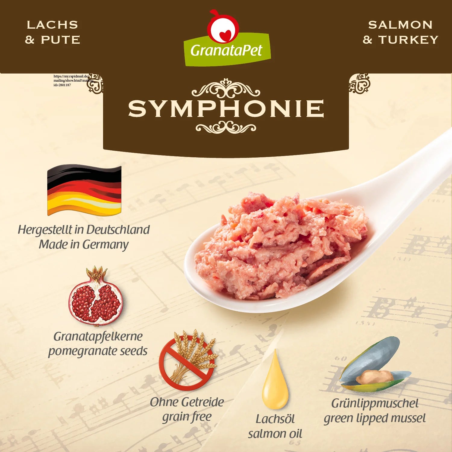 GranataPet Symphonie is a balanced, complete wet food for cats and contains an especially generous serving of meat. The tender chunks of fillet are delicately blanched and gently cooked during packaging. The cooking process produces the natural jelly, which contains precious nutrients and is enjoyed as a real delicacy by cats. This gentle production process preserves important vitamins, nutrients and essential fatty acids. The high meat content (made up exclusively of lean meat and liver) is enriched with premium-quality salmon oil and pomegranate seeds.